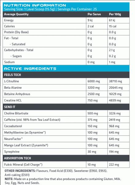 L-Citrulline – 6g Caffeine – 375mg – Caffeine is a central nervous system stimulant that increases performance both physically and mentally. Dynamine – 100mg – NeuroFactor – 100mg – Neurofactor is derived from the coffee arabica plant and is shown to increase neuroprotein BDNF which is a key for memory and learning. Zynamite 100mg – Zynamite is mango leaf extract which can enhance both mental and physical capacity