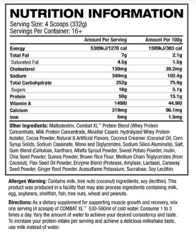 Mix one serving (4 scoops) of Combat XL with 300-400ml. of cold water. Consume 1 to 3 times a day. Vary the amount of water to achieve your desired consistency and taste. To increase your protein intake per serving and achieve a delicious milkshake taste, use milk instead of water.