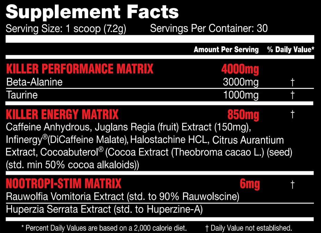 Killer Labz Stim Reaper is a hardcore energy and focus pre workout featuring the strongest combination of adrenaline-boosting stimulants on the market. Highlighted by massive doses caffeine anhydrous, J. Regia, Eria Jarensis, and Alpha-Yohimbine, Stim Reaper delivers relentless energy coupled with animalistic determination to help you kill every workout.